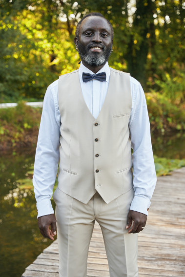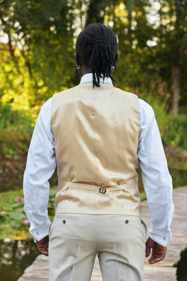 Gilet slim assortit au costume SUAT en mélange laine extensible dans un beau tissu uni craie, idéal pour un mariage ou pour le travail ! Son tissu et son coloris tendance vous séduira !