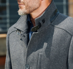 Manteau homme réalisé dans un magnifique tissu diagonal gris, col droit avec effet cuir et patte de col, belle doublure fantaisie intérieure avec poches intérieures. En savoir plus